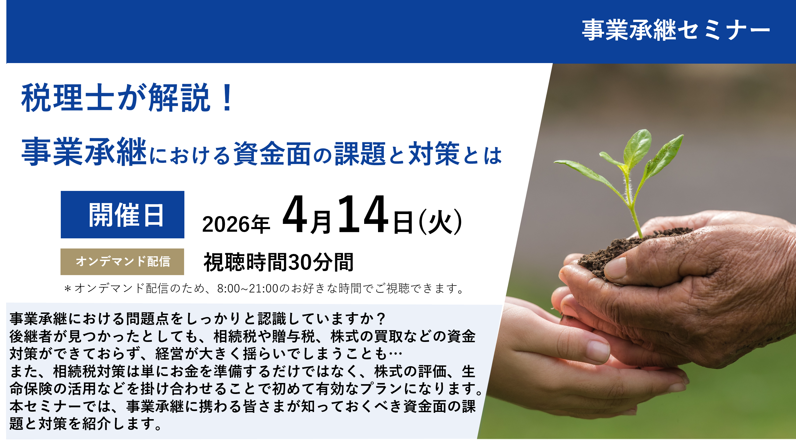 | 開催時間 | 30分(8~21時の間のオンデマンド配信でお好きな時間にご覧いただけます) | ||||||||