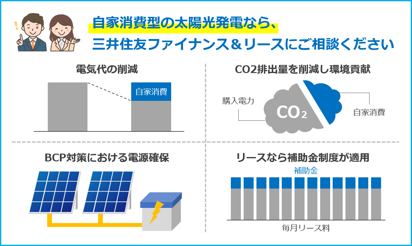 再生可能エネルギー設備に関する多くの実績を有するSMFLが、自家消費型太陽光発電設備の導入をサポート致します。